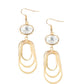 Oval shaped gold frames drip from the bottom of an oversized white rhinestone gem, creating a rippling fringe. Earring attaches to a standard fishhook fitting.
