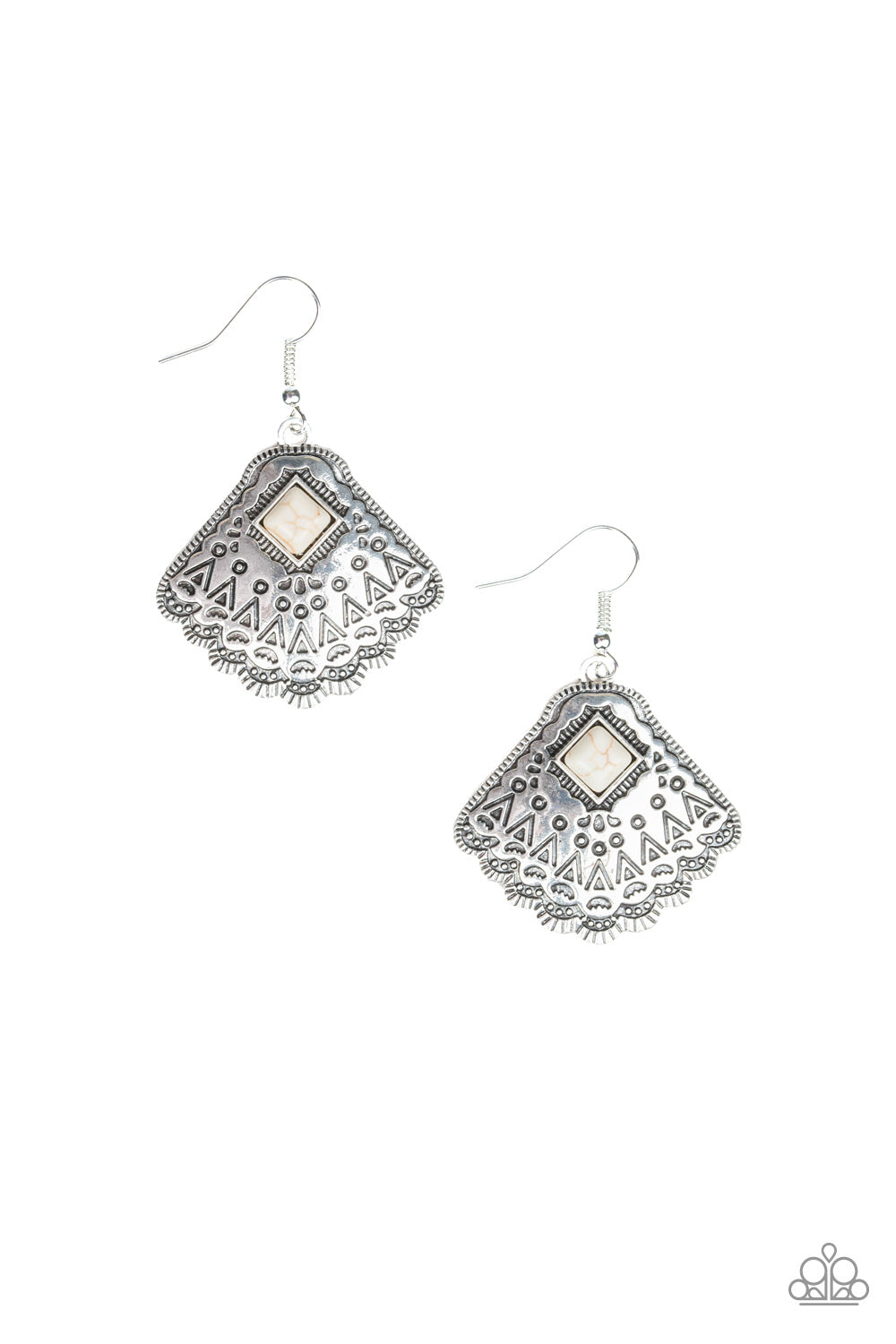 Stamped in tribal inspired patterns, a shimmery silver frame fans out from the bottom of a square white stone for a seasonal flair. Earring attaches to a standard fishhook fitting.